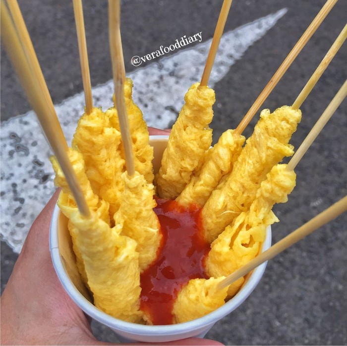 Ini dia jajanan SD yang belakangan ini kembali hits di kalangan anak muda. Telur gulung menjadi favorit anak-anak SD karena cara memasaknya yang menarik, dan rasanya lebih enak ketika ditambah saus di atasnya. dan ada juga yang divariasikan dengan pentol yang ditusuk di lidi kemudian digulung dengan telur. Ada yang masih ingat harganya?